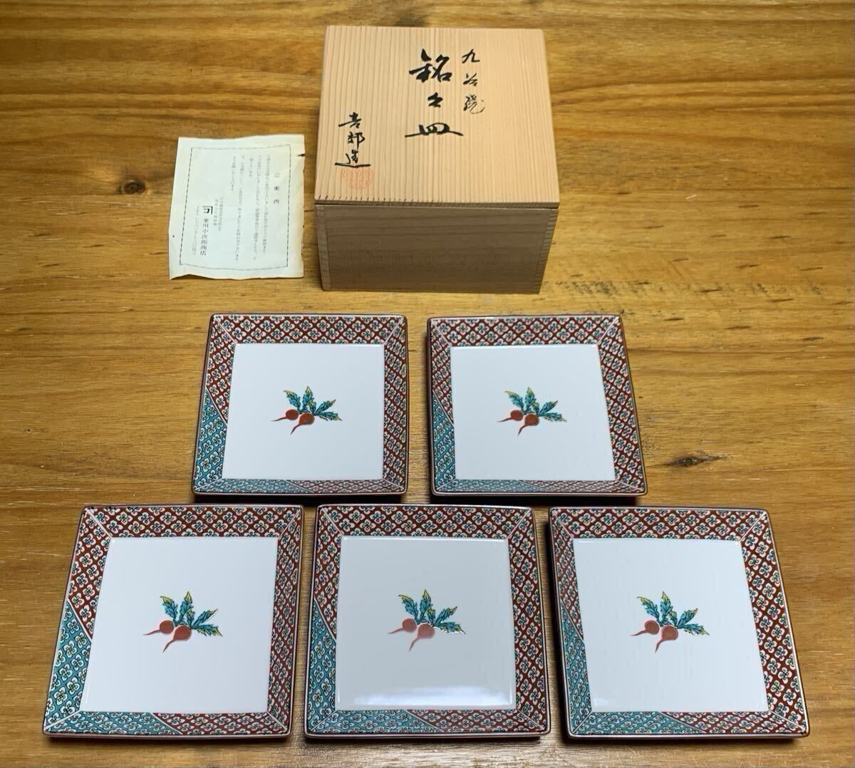 > 九谷焼 青郊窯 角皿 5枚セット 赤かぶ 4号皿 五彩 陶器 銘々皿 うつわ 和食器 九谷青郊 色絵