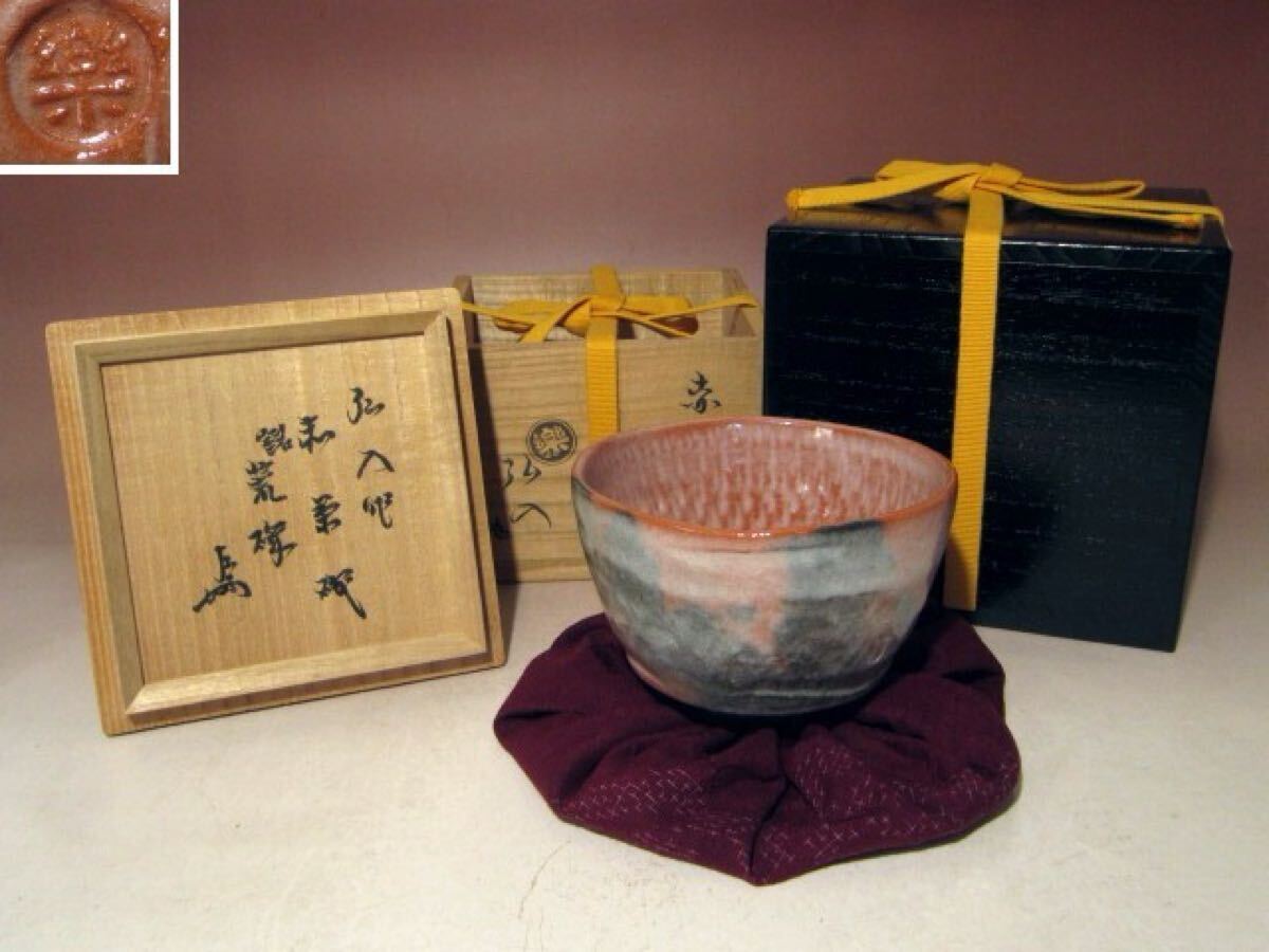 - 楽十二代 弘入 赤茶碗【荒磯】★表千家十三代即中斎花押★二重箱★o659