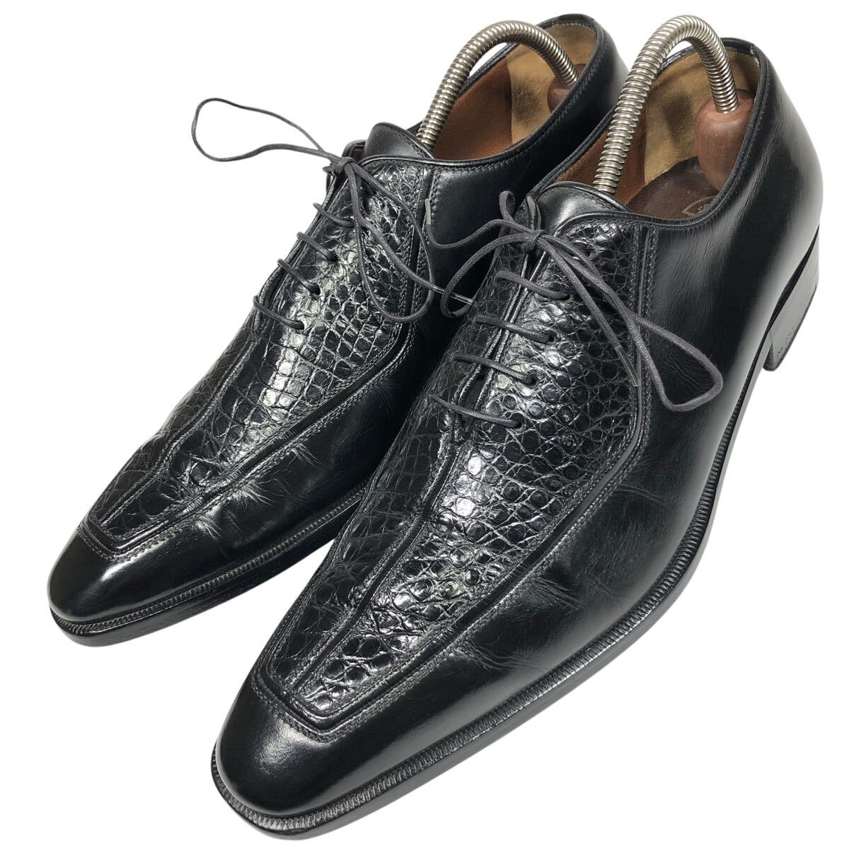 > 【ア・テストーニ】本物 a.testoni 靴 26cm 黒 クロコダイル 黒タグ Uチップ ビジネスシューズ 内羽根式 ワニ革 男性用 メンズ 伊製 7 G