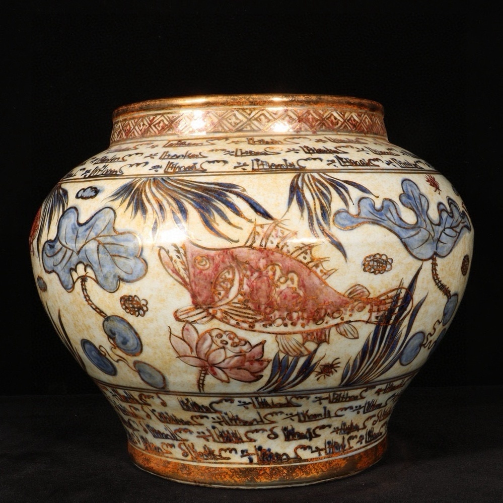- 時代旧蔵 元時代 青白 釉に金 魚の藻紋 を赤く描いた缶 古陶磁器 珍品旧蔵 古賞物 時代物 820