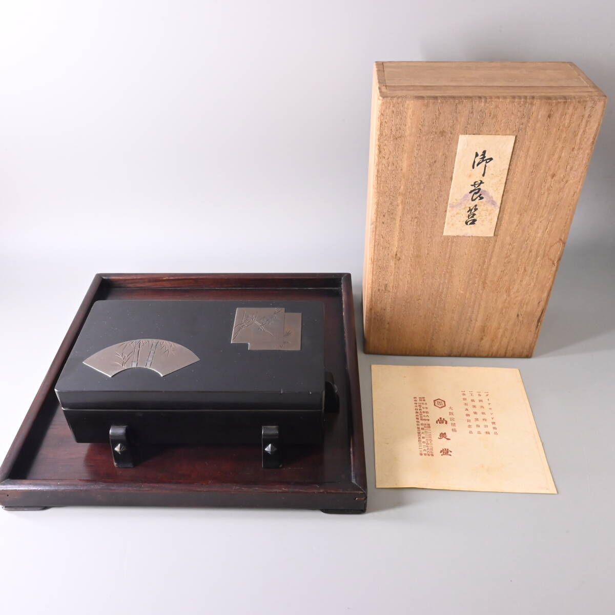 - 112501 尚美堂 御莨筥 共箱 栞 黒塗莨箱 木製漆器 喫煙道具 銀装飾 骨董 古玩 大正昭和 幅15cm 奥行8cm 高5.5cm