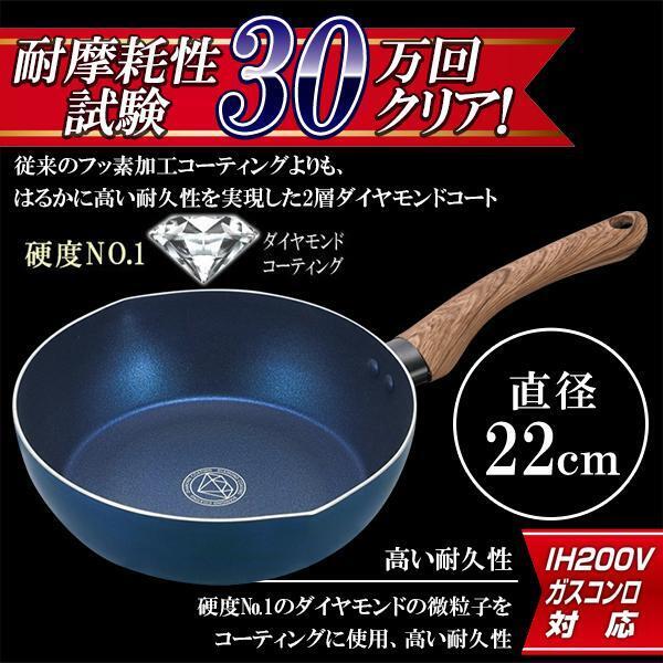 > F359 新品 IH200V/ガスコンロ対応 焦げ付きにくく、傷つきにくい ダイヤモンドコーティング 深型 フライパン 深鍋 雪平鍋 片手鍋 直径 22cm
