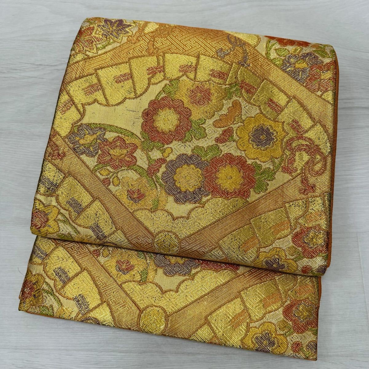 > 袋帯 扇に花模様 紗綾型地紋 煌びやか 正絹 着物 W-3735