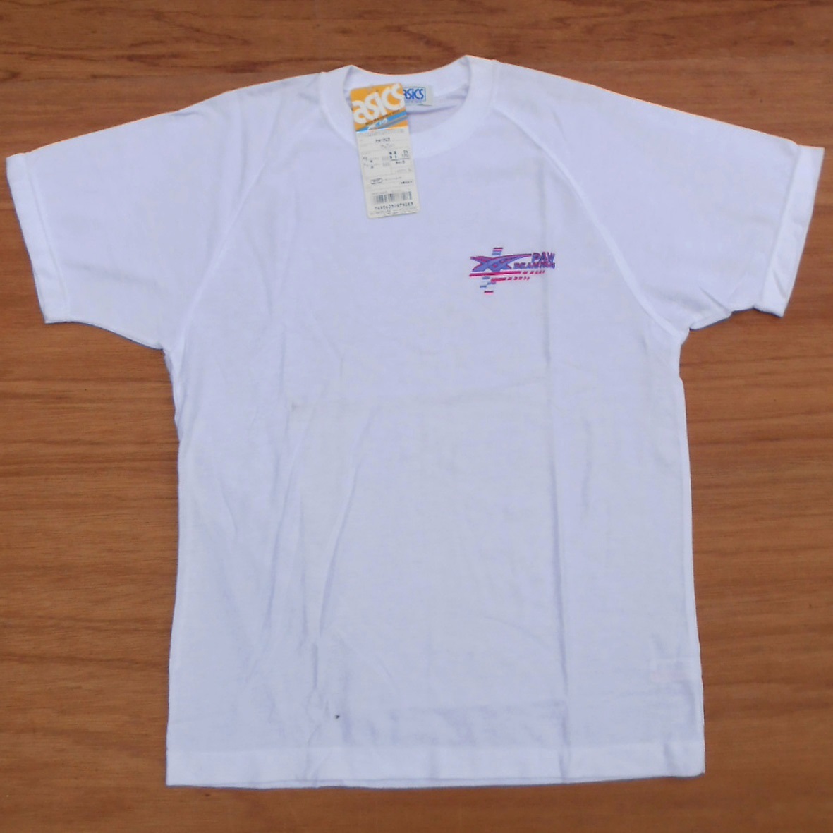 > 未使用 '90s asics PAW アシックス パウ L 半袖 Tシャツ 白x紫xピンク バッタxロゴ刺繍 ホワイト ゴールドタイガー 日本製 デッドストック