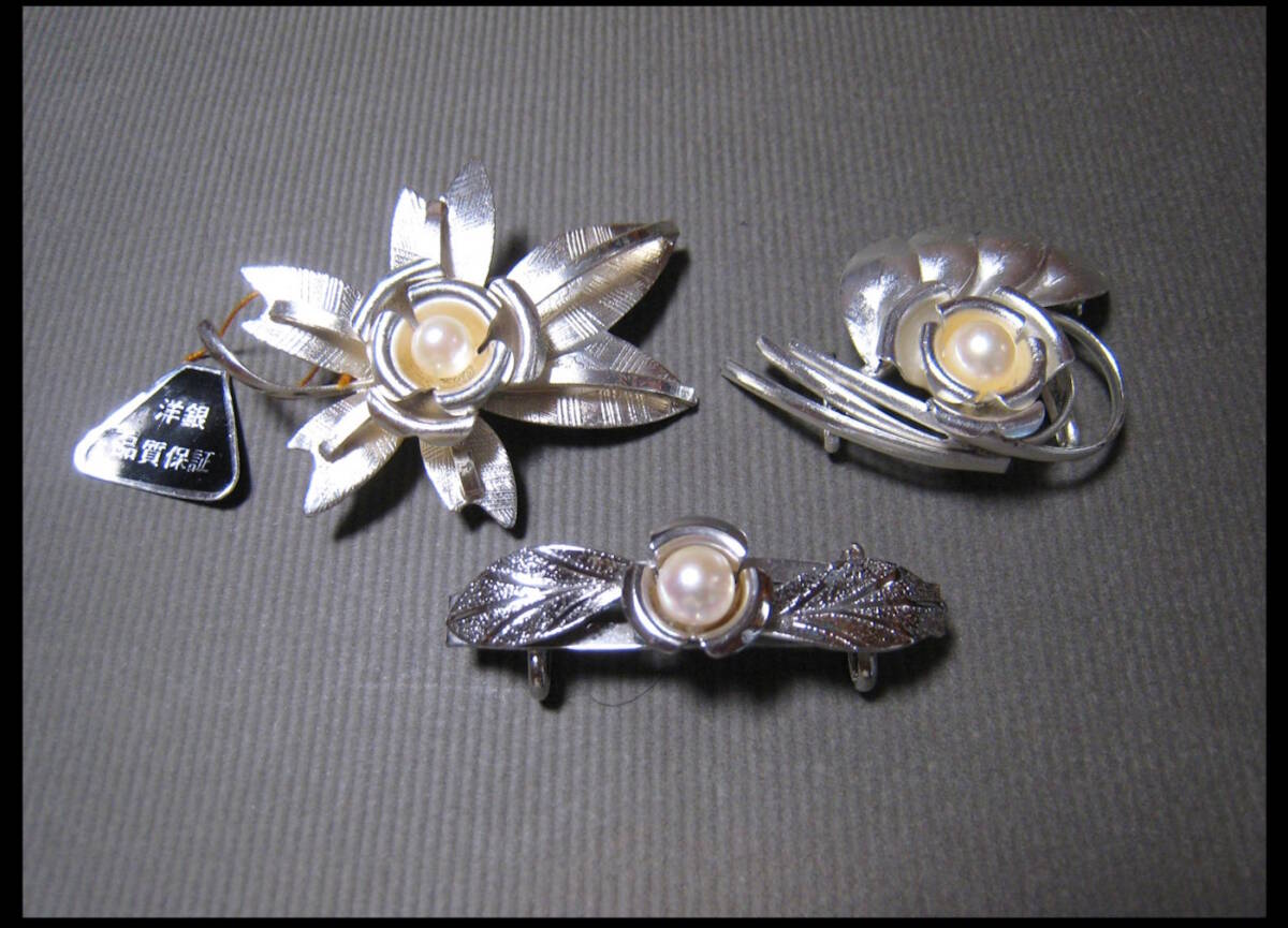 - 彫金 洋銀 パール飾り 花唐草 花型 葉と花 3種 帯留 着物 飾り 和装アクセサリー