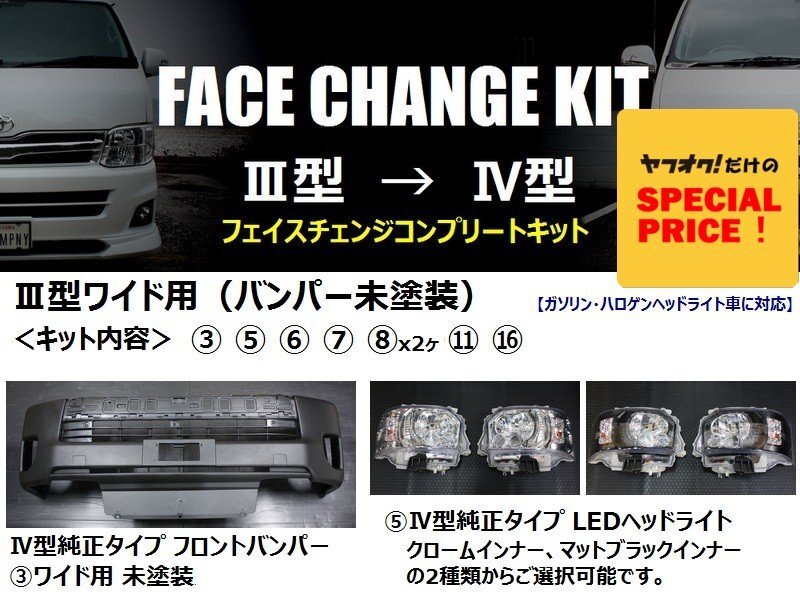 > ■ ハイエース 200系 ワイドボディ [3型 → 4型] フェイスチェンジキット ディスチャージ バンパー 未塗装 S-GL ワゴンGL グランドキャビン