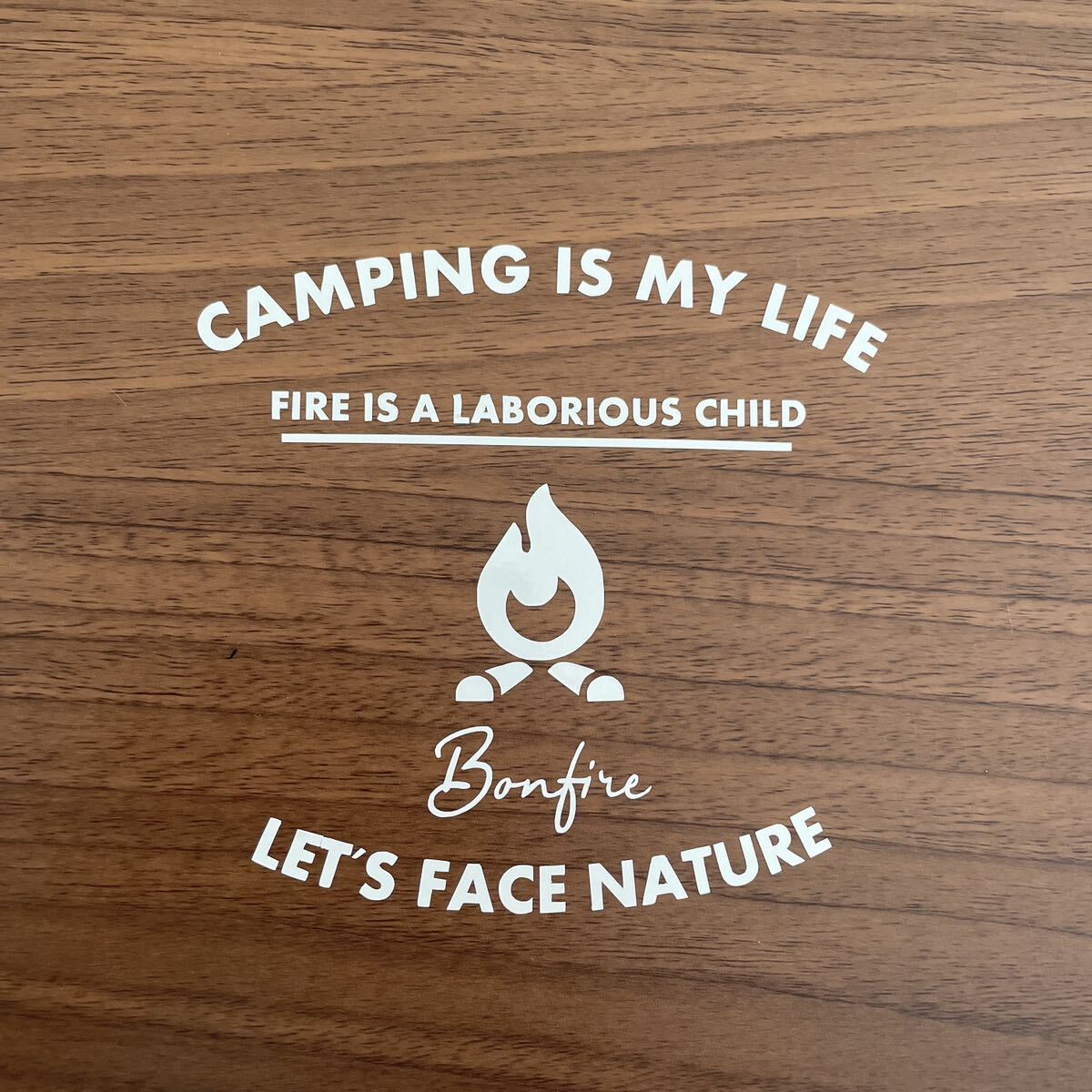 - 214.【送料無料】 大ステッカー 焚き火 「火は手のかかる子供である」 カッティングステッカー キャンプ テント CAMP Bonfire【新品】