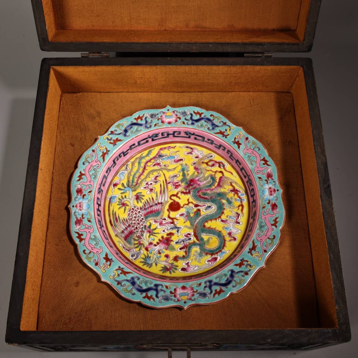- 清時代 古陶磁器 宮藏 手絵 琺瑯彩 龍紋 花辺 盤 盤子 盤 陶芸 文案置物 擺件 時代物 古董品 骨董 旧家蔵出し 唐物 中国古玩 古美術品
