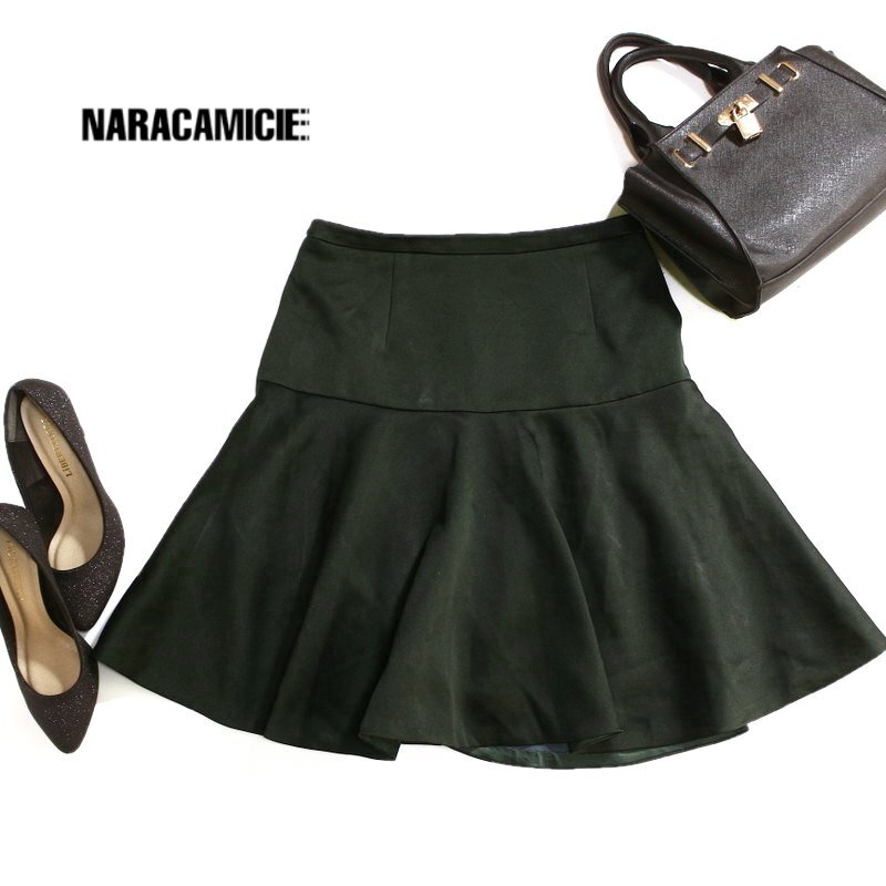 > 美品 ナラカミーチェ NARACAMICIE 女性らしい 綺麗め 膝下丈 艶 光沢 Aライン サテン フレアスカート ⅠM 9号 グリーン 緑 通勤 綺麗め