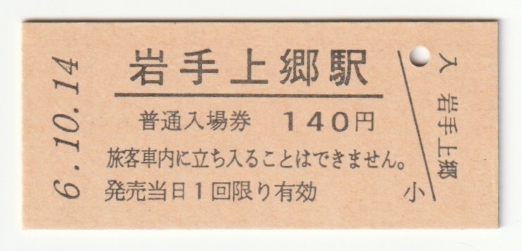 - 平成6年10月14日 釜石線 岩手上郷駅 140円硬券普通入場券(日付印刷)
