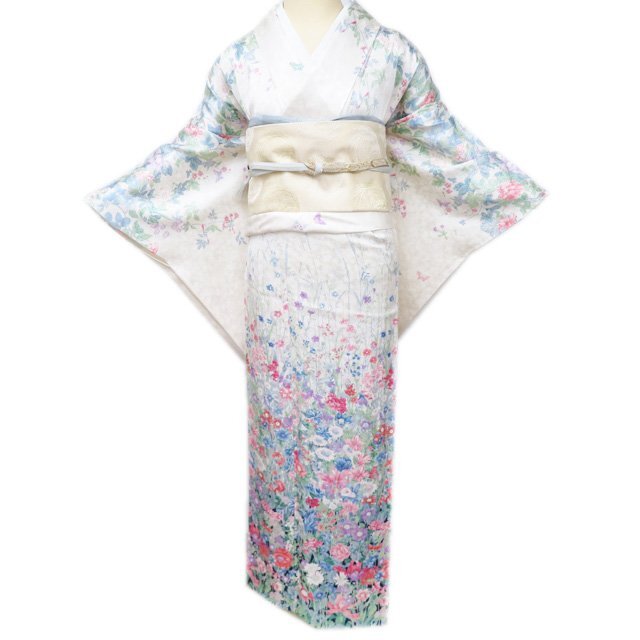 - 訪問着 着物 中古 正絹 単衣 フォーマル 花模様 花園 蝶 オフホワイト 多色 身丈165.5cm 裄68cm L トール きもの北條 A1261-10