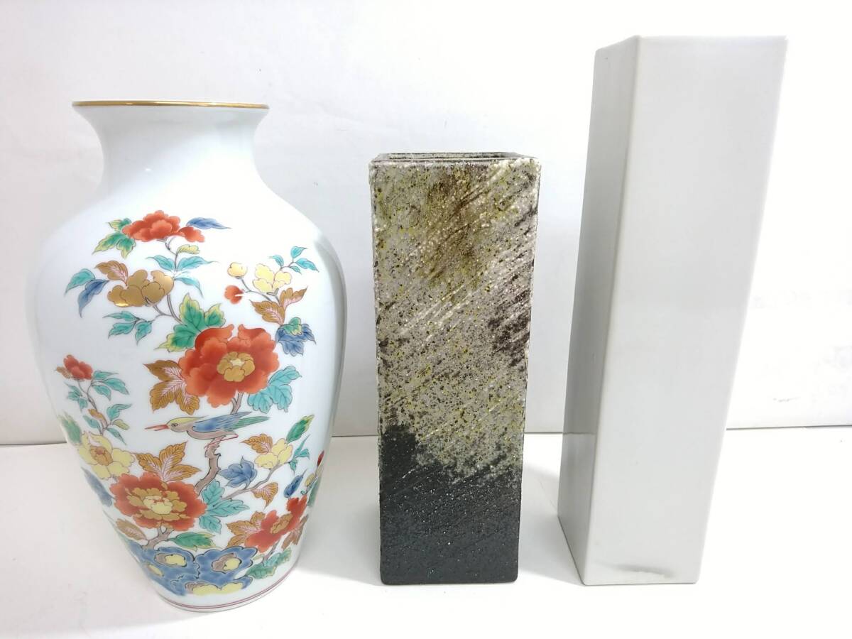 - 【うぶだし】秀峰 造 花鳥文 色絵金彩 花瓶含む 花器 おまとめ3点セット/信楽焼/角花入/花生/華道具/在銘/床の間飾り/茶道具/10-RHB45
