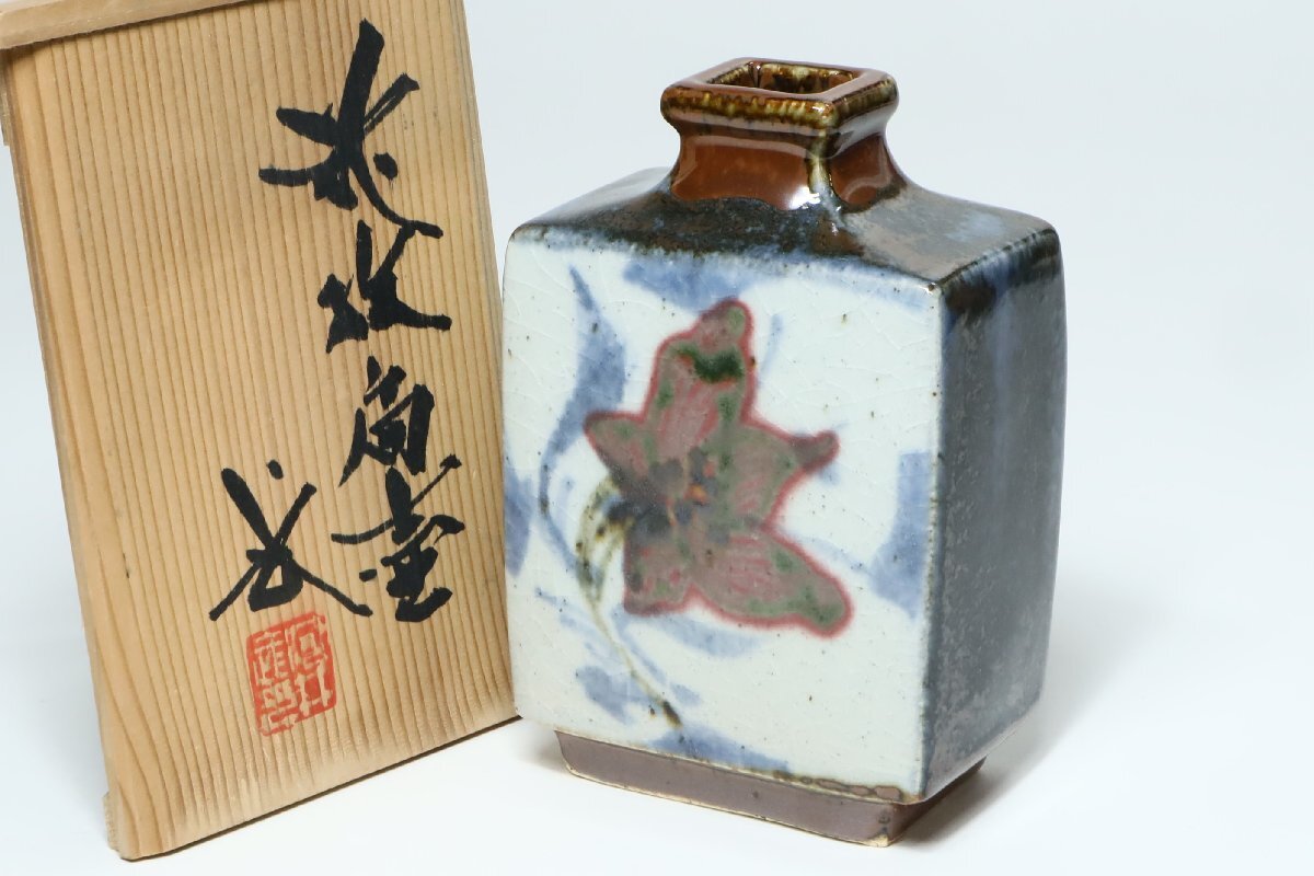 ・益子焼 河井武一 花紋扁壷 共箱 /花瓶 一輪挿し 花器 民芸