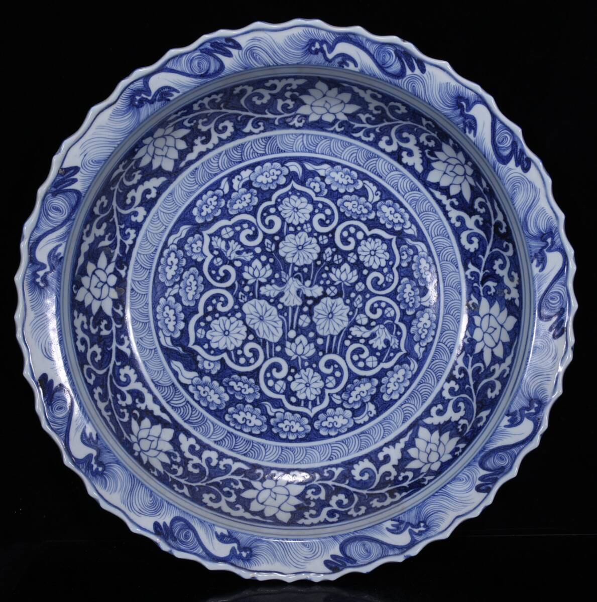 - LM145■元時代 青花纏枝蓮花卉紋盤 収蔵珍品 古玩 唐物 古陶磁器■