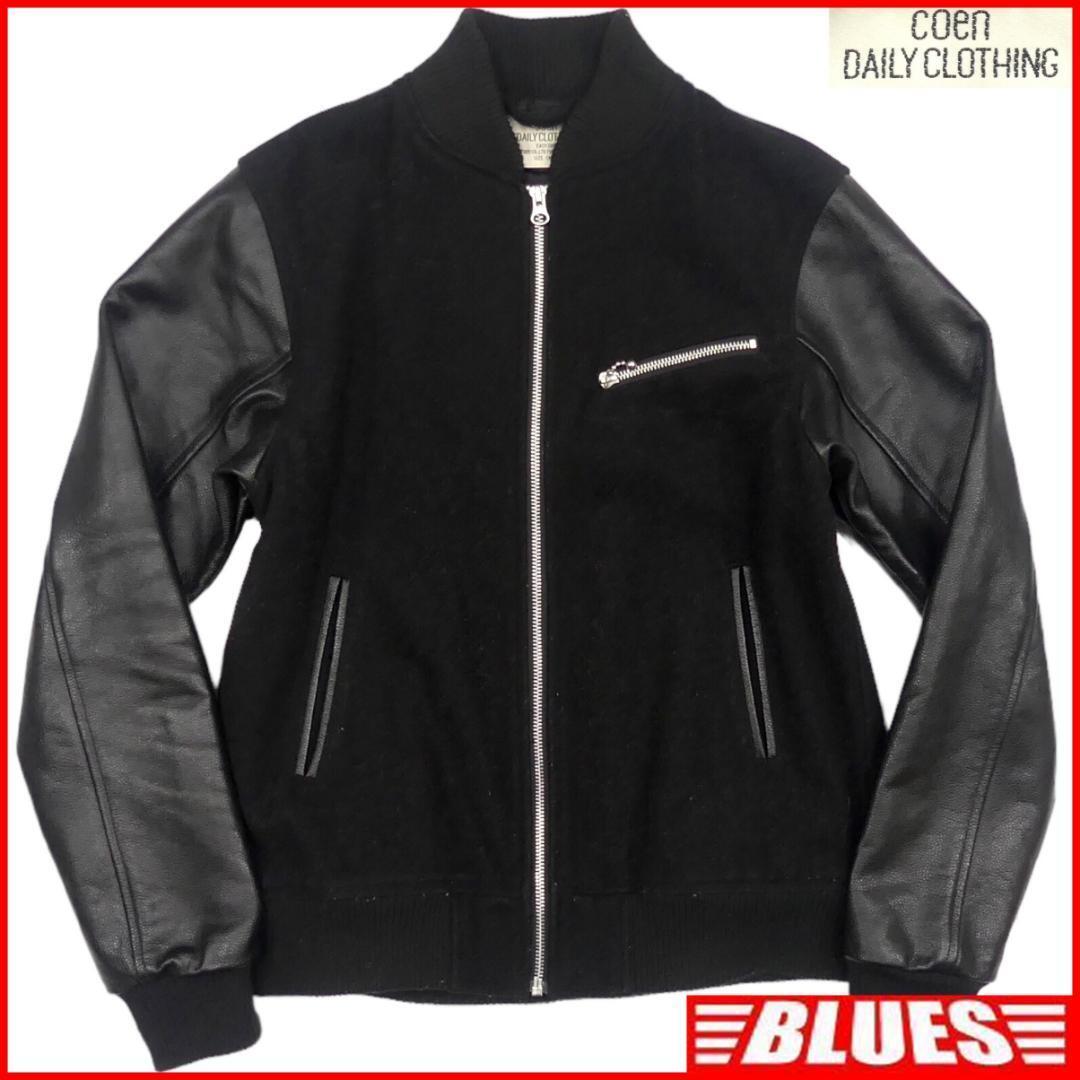 - 即決★COEN★メンズS レザーアームスタジャン コーエン 黒 ウール 本革 ブルゾン 本皮 ジャンパー 革ジャン