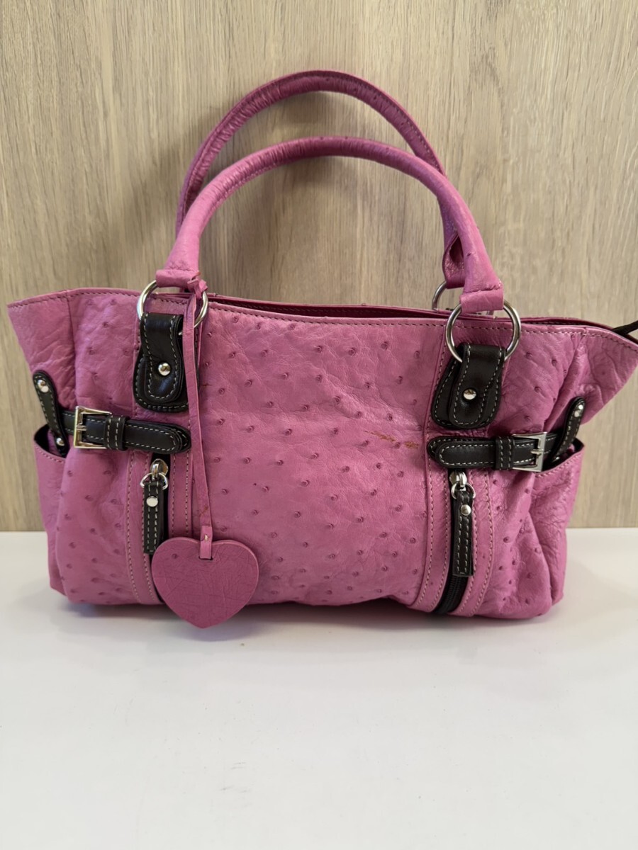 - 【中古品】 ハンドバッグ レザー オーストリッチ ハートチャーム ピンク 現状品