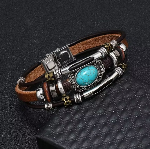 - ブレスレット 新品 メンズ レザーバングル ボヘミア 緑松石 チタンステンレス 紳士 アクセサリー 総長21センチ 長さ調整可能 /茶色