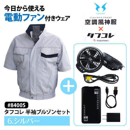 - 空調風神服 バッテリーファン空調作業服 メンズ スターターセット【 #8400S 】半袖ブルゾンフルセット ■LLサイズ■シルバー色 綿100%