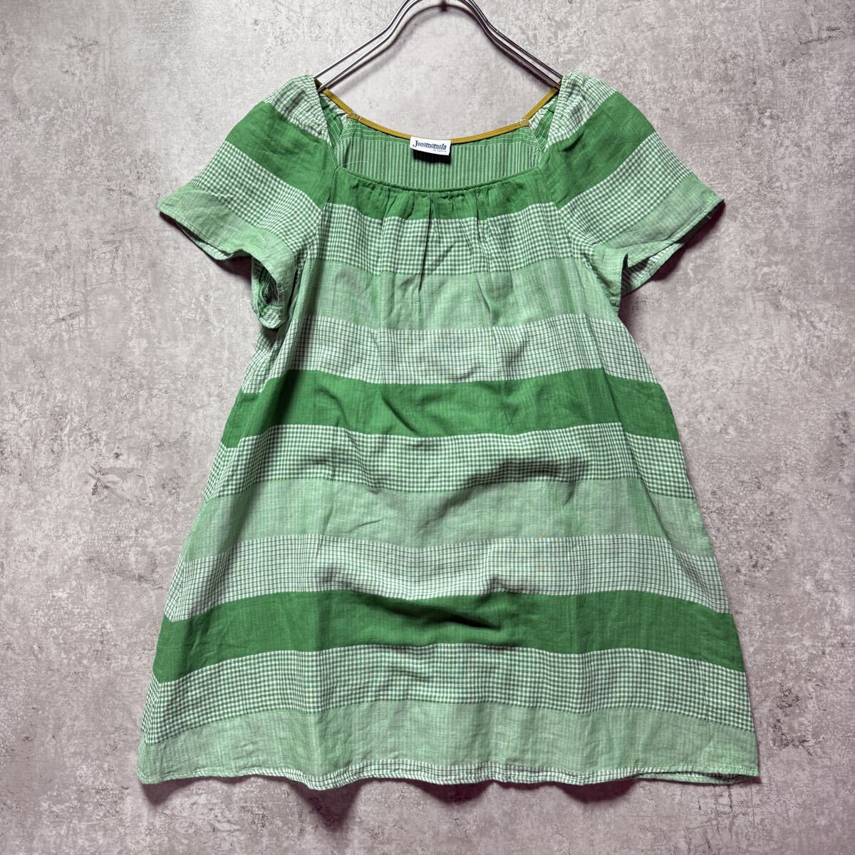 - Jocomomola ホコモモラ ストライプ チェック ブラウス グリーン 緑 スクエアネック サイズ40 綿100 チュニック レトロテイスト
