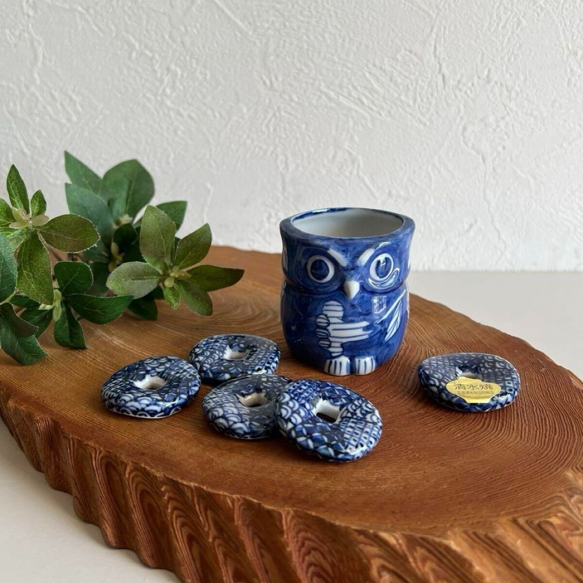 - wasabi k804 染付 ふくろうの楊枝入れ(ミニポット)・清水焼の箸置き 5個 和食器 縁起物として愛されるフクロウと丸い箸置きのセットです