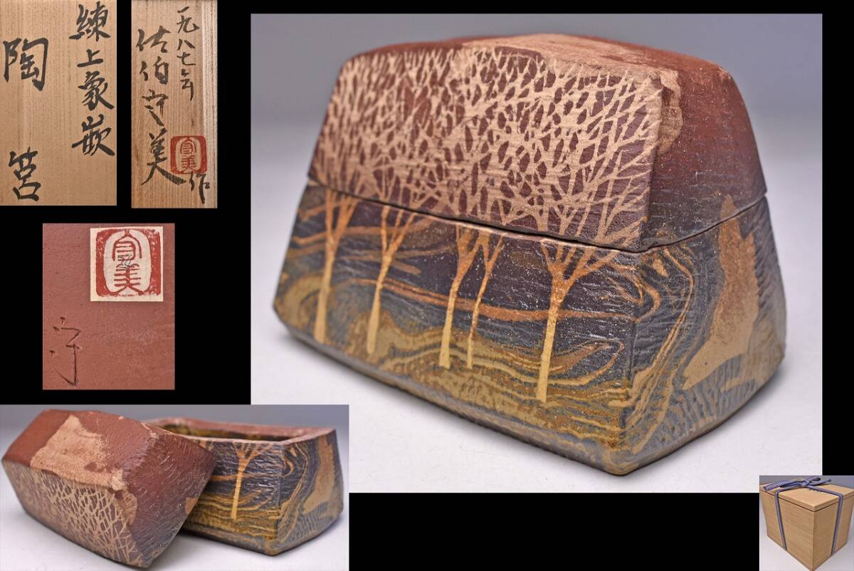 - 佐伯守美 ★ 練上象嵌陶筥 ★ 共箱 ★ 練込タイプ ★ 樹木文 ★ 益子焼 の地で作陶 ★ 人気陶芸家 ★ saekimoriyoshi ★ 蓋物 陶箱