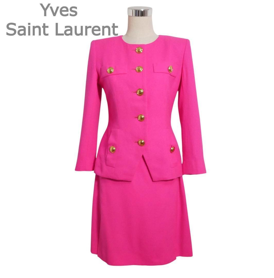 - Yves Saint Laurent イヴサンローラン サイズ36 ウール 金釦 ノーカラージャケット 膝丈 スカート セットアップ スーツ ピンク