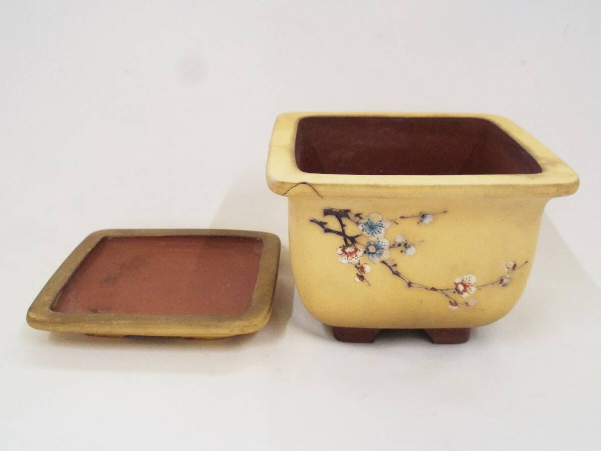 - 中国 盆栽鉢 梅花漢詩彫 白泥 唐物 四方鉢 古盆器 中国宜興 中国古玩