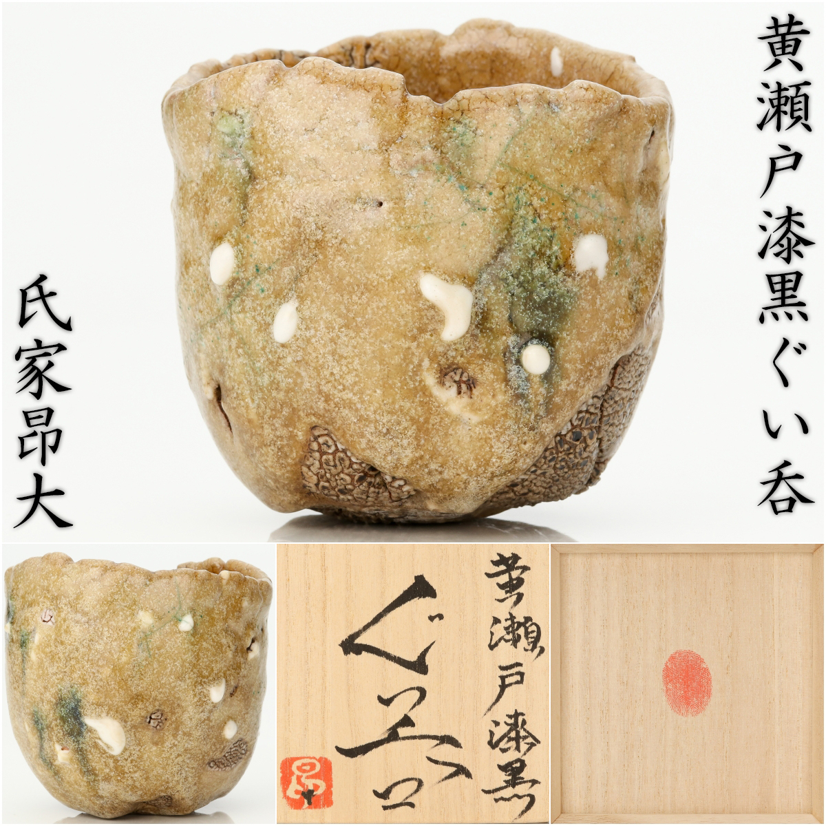 - 氏家昂大『黄瀬戸漆黒ぐい呑』希少秀逸作 共箱 共布 栞 本物保証 送料無料【松森美術】