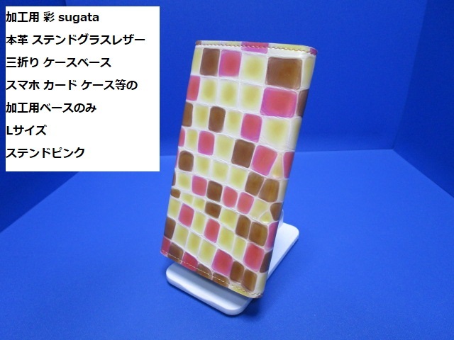 - 加工用 彩 sugata 本革 ステンドグラスレザー 三折り ケースベース スマホ カード ケース等の加工用ベースのみ Lサイズ ステンドピンク