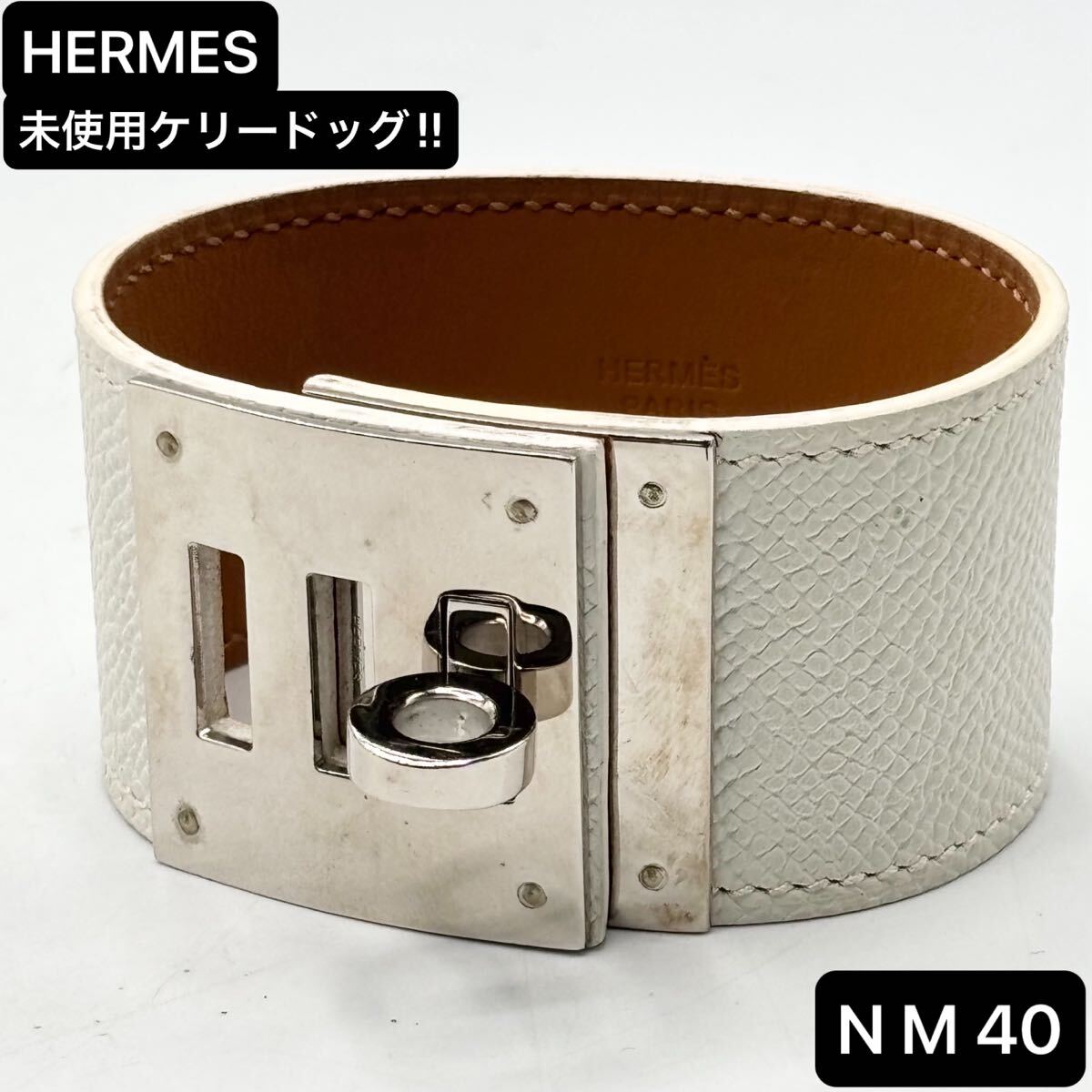 > ¥1~ HERMES 未使用 ケリードッグ ブレスレット バングル レザー ホワイト シルバー N M 40 made in France ブランド 刻印有り ギフトOK!