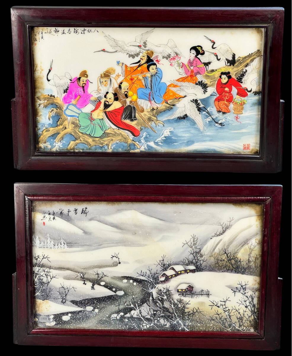 > 【偲】陶板画 陶額 硯屏 屏風 八仙 冬景色 中国山水画 幅約28㌢ 高約17.3㌢ r-698