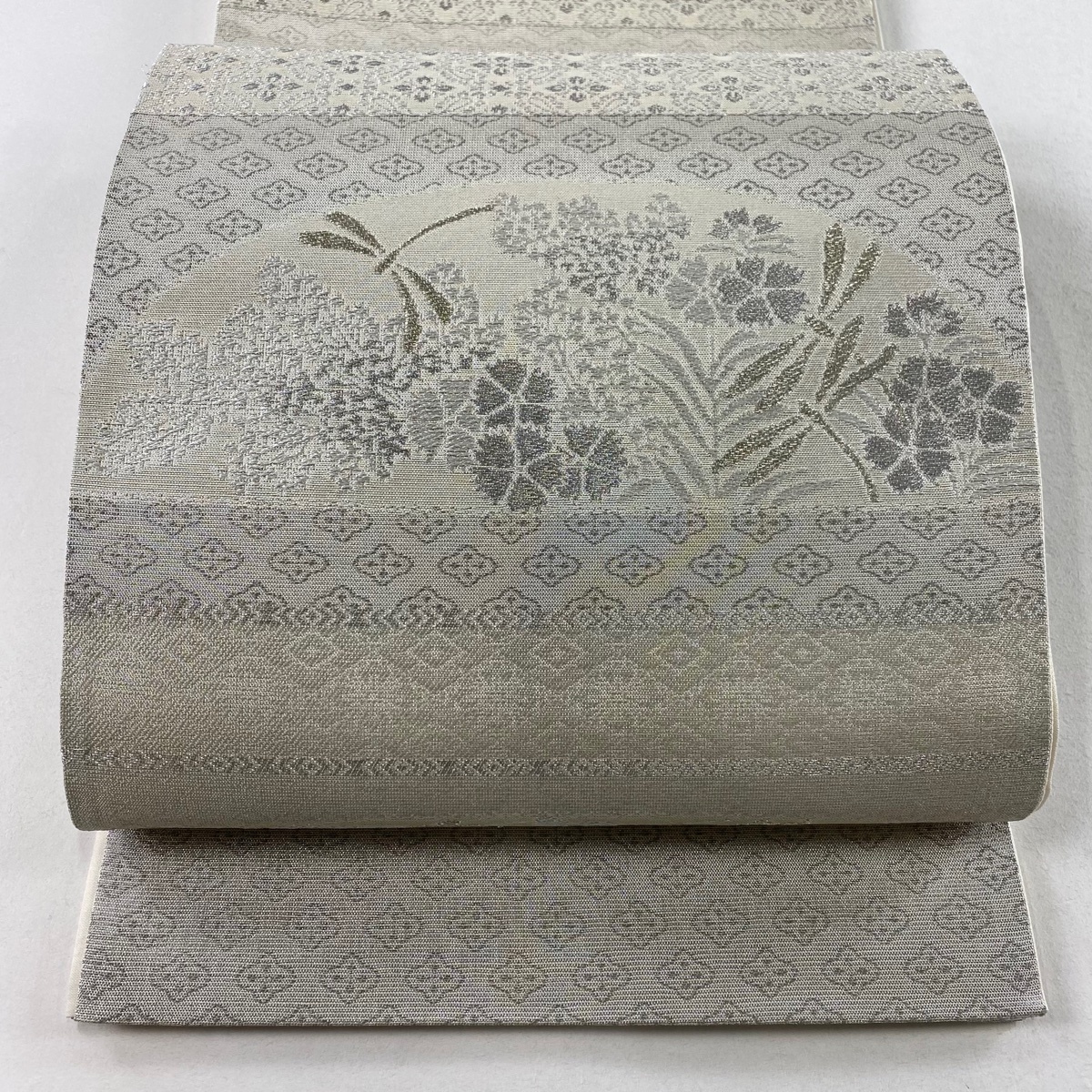 - 袋帯 美品 名品 落款 トンボ 秋草 銀糸 箔 銀色 六通 正絹 【中古】