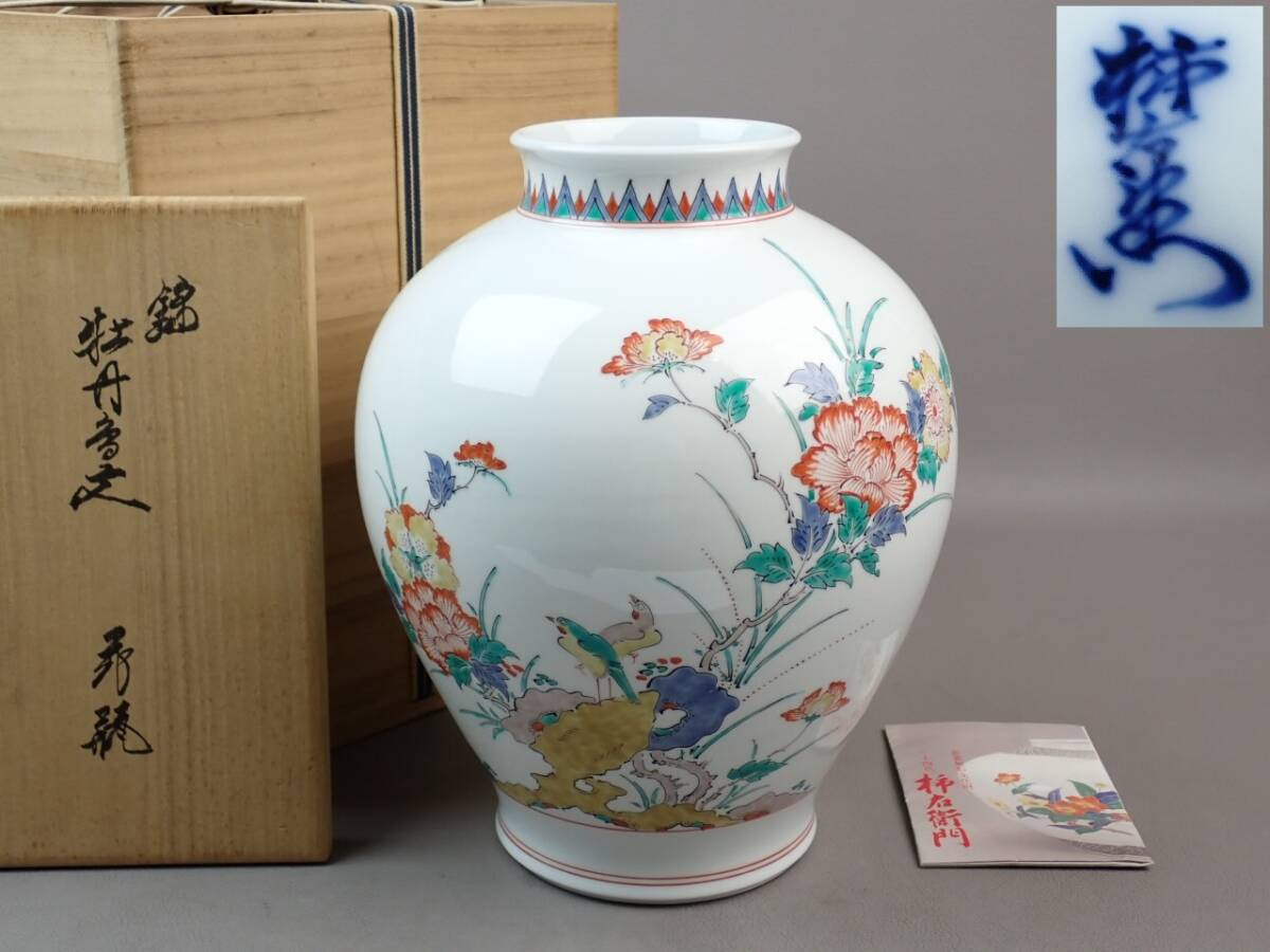 - 【骨董・茶道具】★人間国宝 十四代 酒井田柿右衛門★★牡丹鳥文花瓶 go009ul 壷 花入 花道 華道