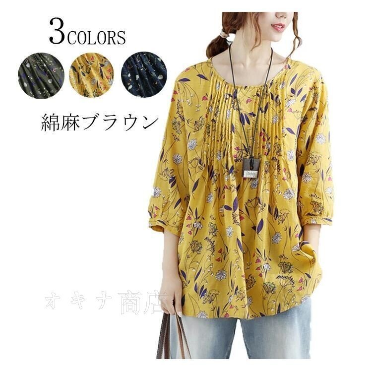 > ブラウス レディース 7分袖 春 夏 シャツ トップス チュニック 丸首 綿 リネン コットン 花柄 体型カバー ゆったり 大きいサイズ