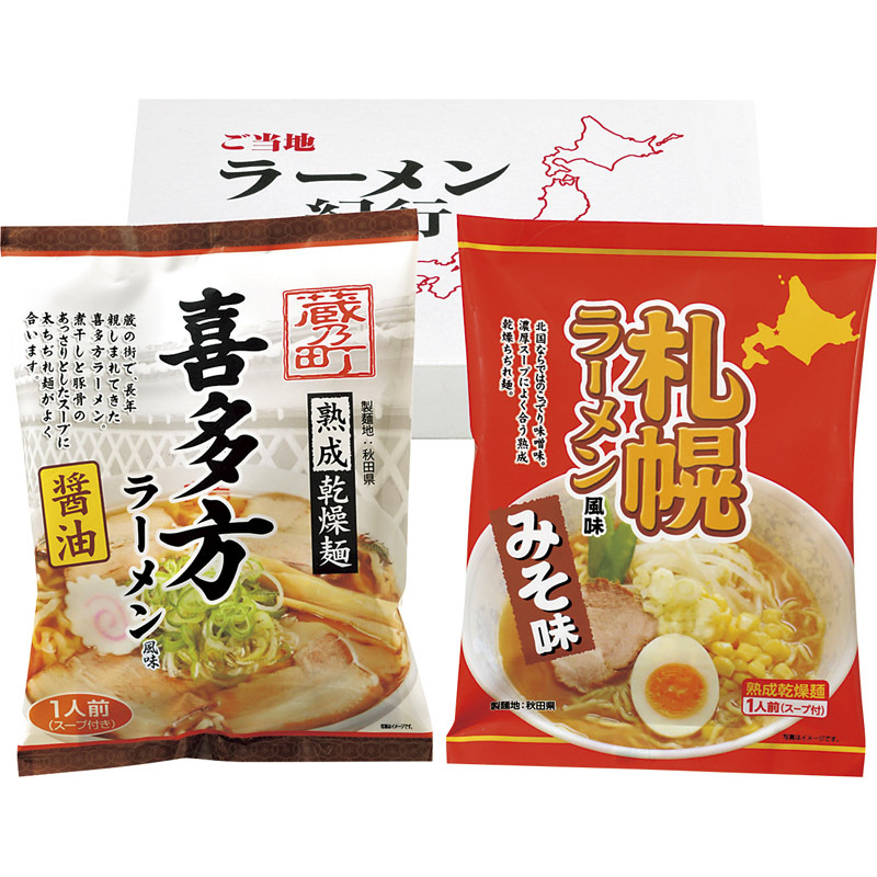 〇注意事項・送料800円が販売価格に含まれています・お取り寄せ商品です。弊社にて手配後、メーカー・卸業者からの直送になります。・まれにメーカー欠品、出荷遅延等が発生致します。問題発生時は別途メールにてご連絡致します。・配送方法の指定、日時指定、置き配、ギフト対応、他商品との同梱配送などは対応できません。・まとめ買いや複数購入の場合は通常より発送に時間が掛かる場合がございます・複数個口の場合、2階以上への搬入ができない場合があります。(その場合は1階での受け渡しとなります)・大型連休、お盆、年末年始などは発送をお休みさせていただく場合がございます・メーカー都合により、パッケージは予告なく変更される場合がございます・梱包用のダンボールはリサイクル品を使用させていただきます。・注文に関するご連絡(注文確定通知・発送通知など)はメールでご案内させていただきます※商品ページの内容について、少しでもご不明な点などがございましたら購入前に一度ご連絡ください〇商品説明あらゆるギフトシーンにおすすめです!ご当地ラーメン味めぐり。札幌と喜多方をセットしました。〇商品仕様●内容:札幌 味噌味・喜多方 醤油味×各1規格●化粧箱入(230×35×155mm) 350g●加工地:日本●賞味期限:製造日より常温にて180日●アレルギー表示:卵・小麦(出典:株式会社 八大)