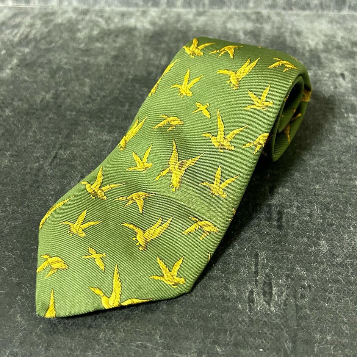 - HERMES エルメス ネクタイ シルク100 鳥柄 総柄 グリーン *AU