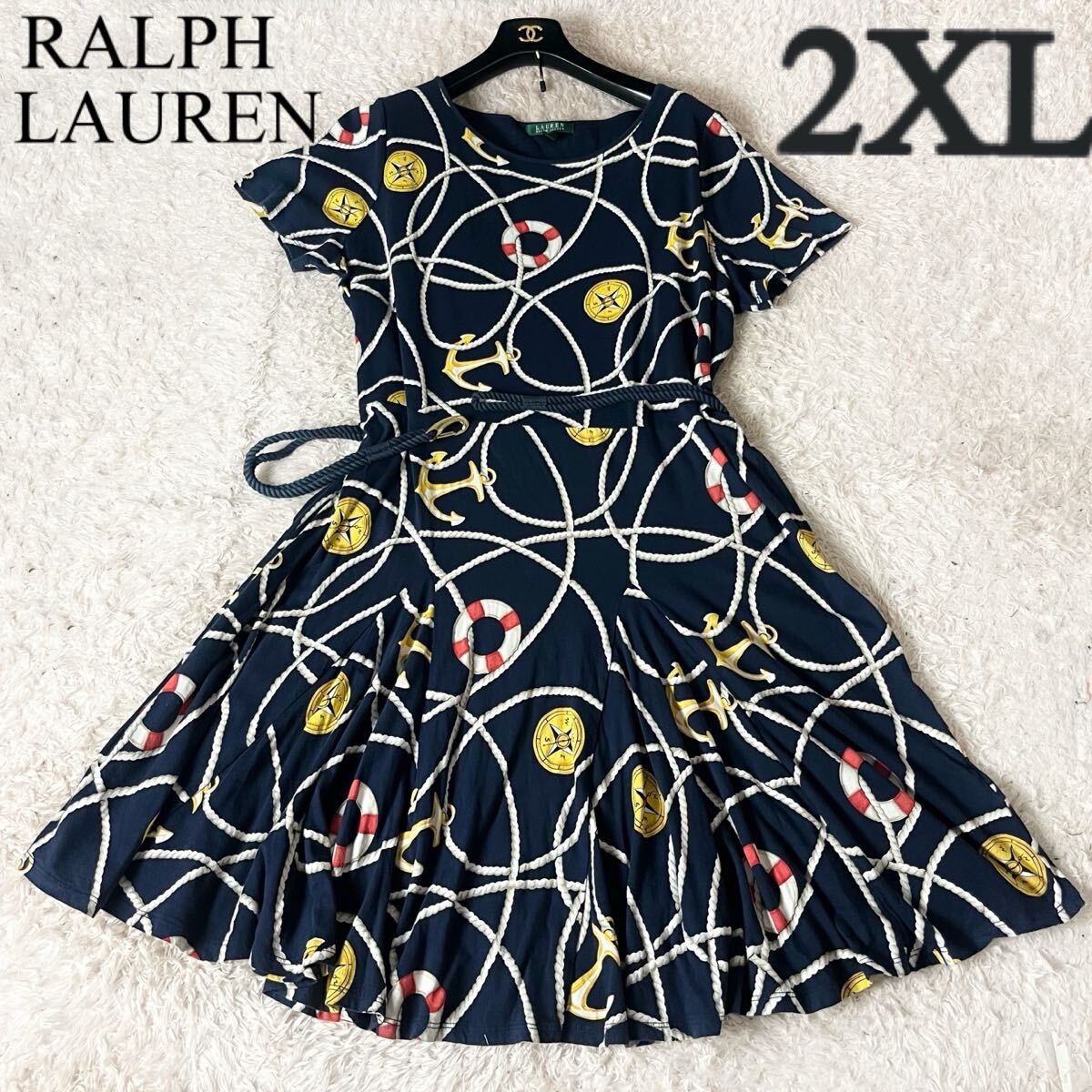 - LAUREN RALPH LAUREN ローレン ラルフローレン ワンピース 膝丈 フレア Aライン 大きいサイズ 総柄 海 ベルト 紺 ネイビー 2XL 3L XXL