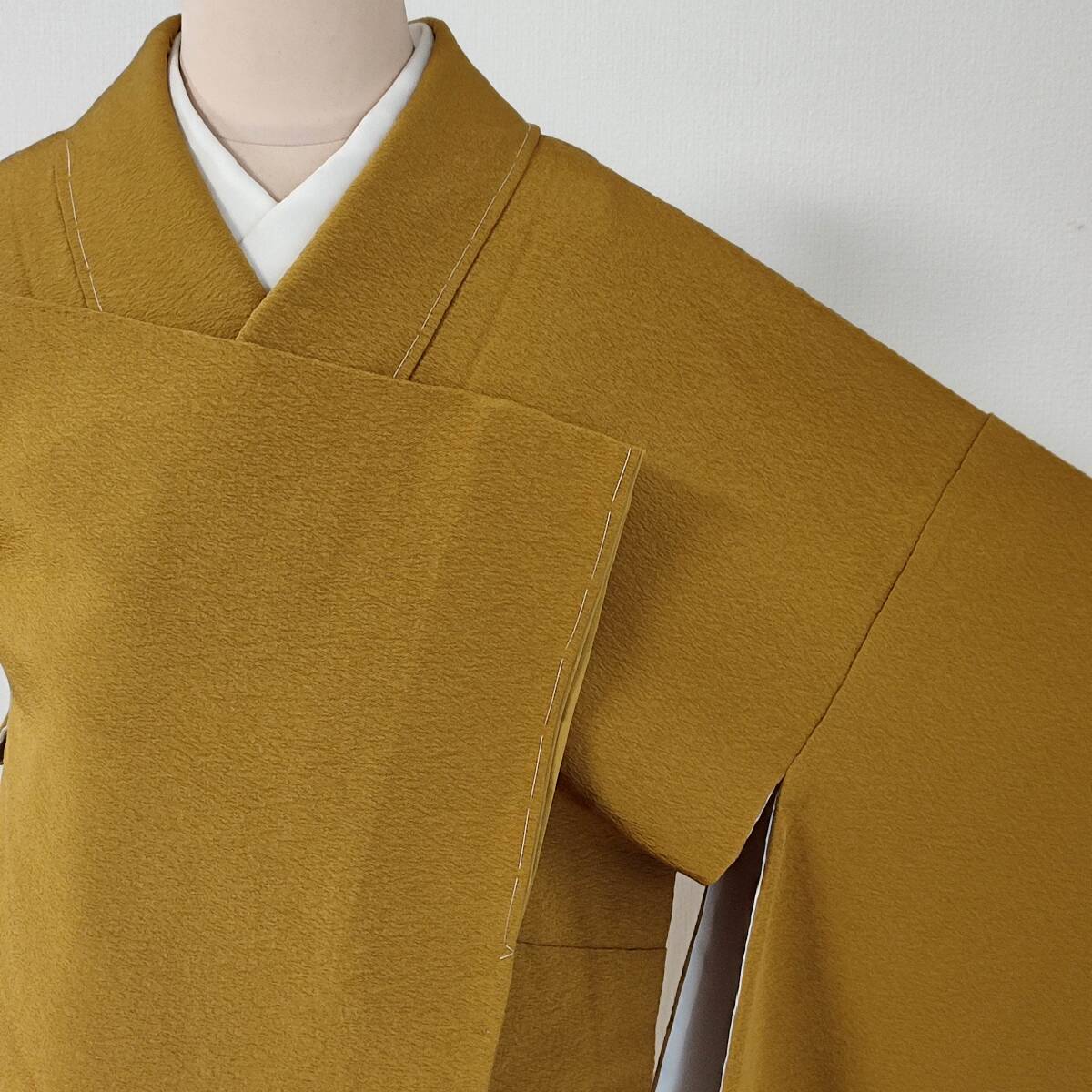> 即決■着物の越田■裄69.5身丈166 正絹 色無地 一つ紋 しつけ糸有り からし色系 美品 裄長■む02E04
