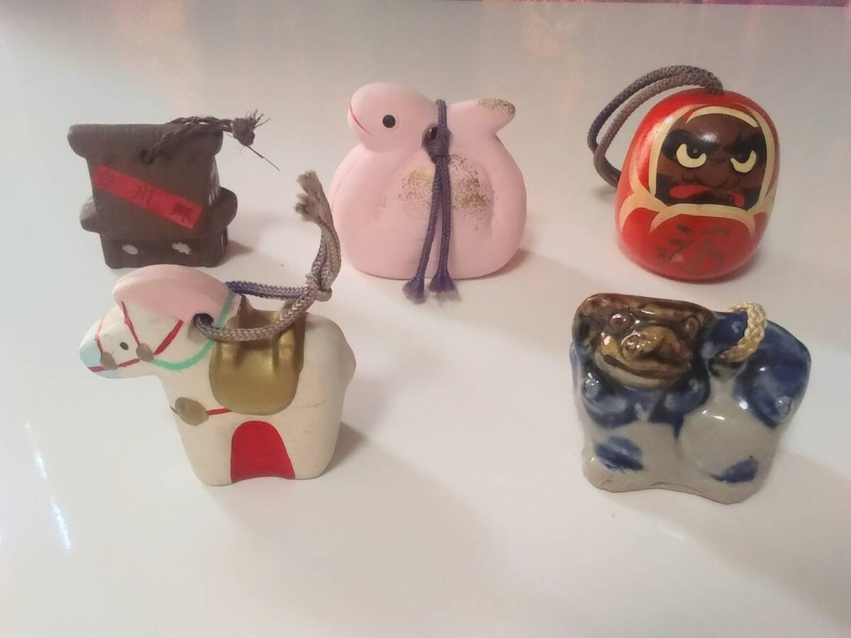 - ビンテージ 民芸品 土鈴 木の鈴 埴輪・狛犬・合掌造り・蛇・だるま 5点まとめて