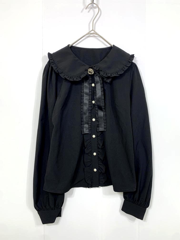 - ゆうパケットOK 美品 Ank Rouge アンクルージュ 3330 パールボタン フリル リボン 長袖 ブラウス シャツ sizeM/黒 ■■