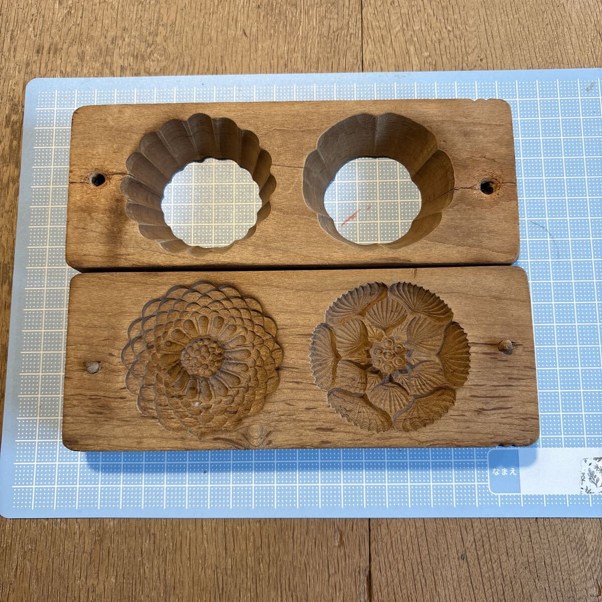 - 古い木製 菓子型 木型 花 縁起物 正月 和菓子 落雁 ねりきり 型抜き 木枠 昭和レトロ
