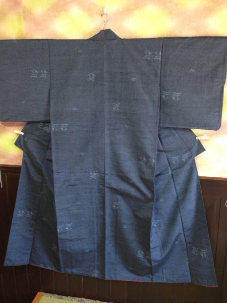 - 【袷】正絹着物身丈141cm 紬 濃縹色に飛び柄 美品 050314