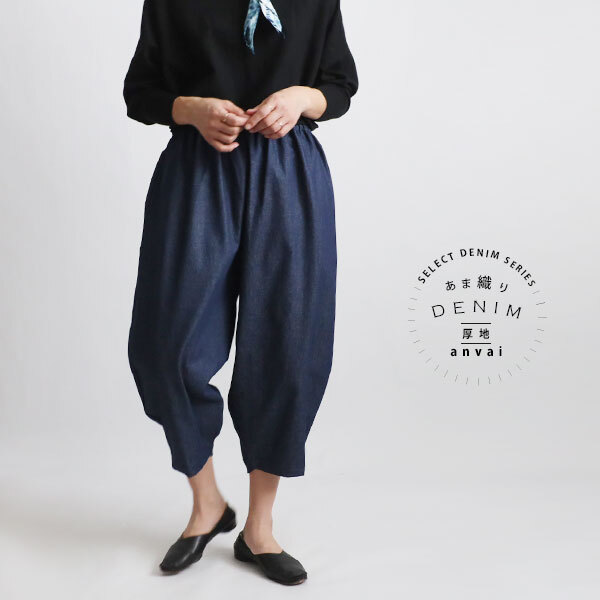 - 秋のパンツ祭り 甘織デニム 85cm丈 定番 ボール バルーン パンツ ゆったり コットン インディゴ H74