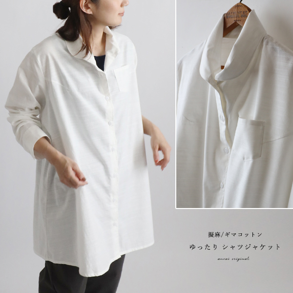 - 芸術の秋SALE 上質ギマ擬麻コットン 丸襟 シャツ ジャケット 背中ダーツ ゆったり 着丈長め オフホワイト R46