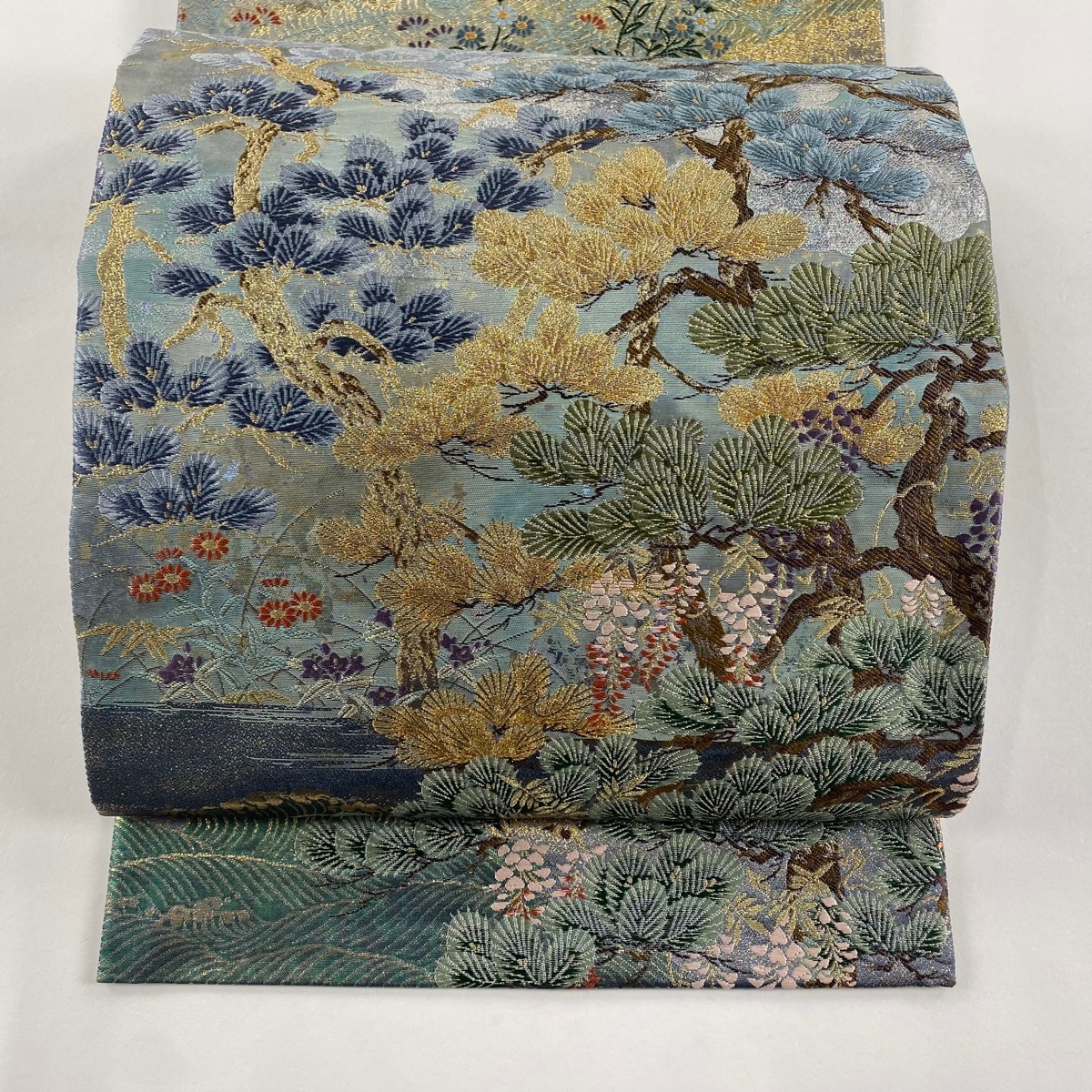> 袋帯 美品 秀品 松 藤 箔 金糸 青灰色 お太鼓柄 正絹 【中古】
