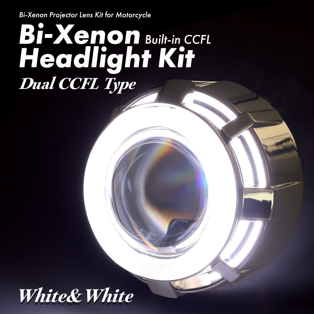 > バイク 汎用 バイキセノンプロジェクター イカリング キット CCFL HID 埋め込みキットホワイト&ホワイト PZ071-W