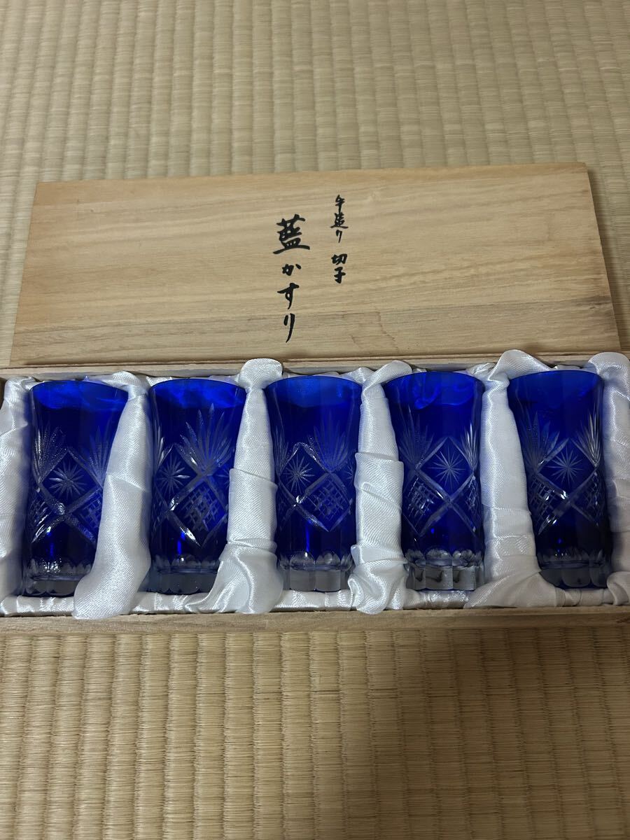 - 木箱 手作り切子 藍かすり AK-102 切子グラス 5客セット 桐箱入り 食器 コップ 長期保管品