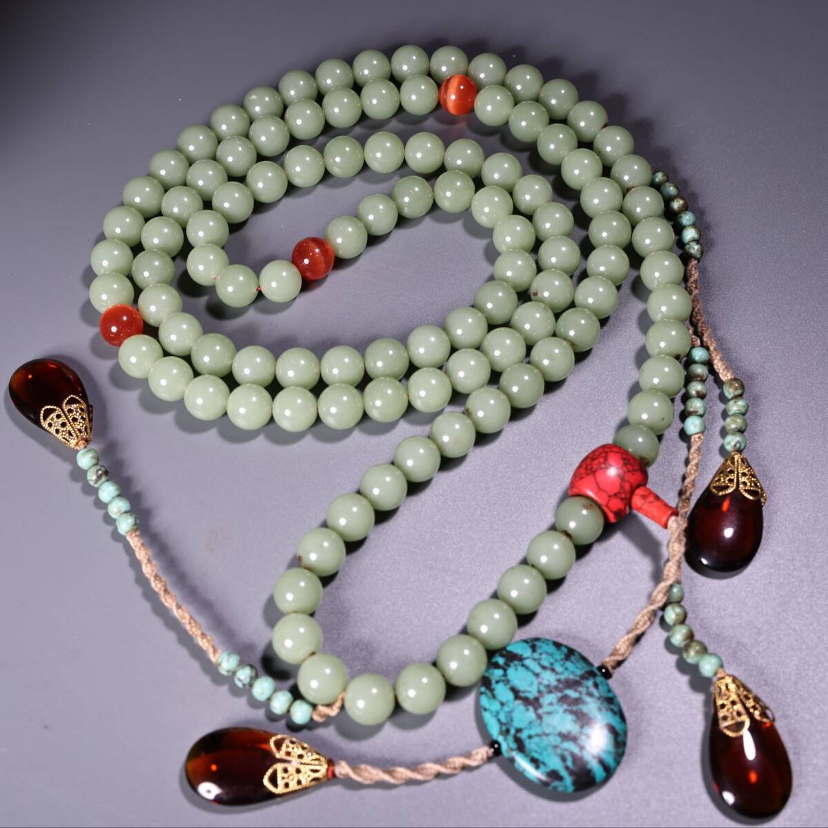 - 『館蔵珍品 和田玉製 細密彫 朝珠 彩繪 神獣紋 箱付 根付 裝身具』稀少珍蔵品 古賞物 貴重物品 収蔵品 中国古美術 時代物 古董品