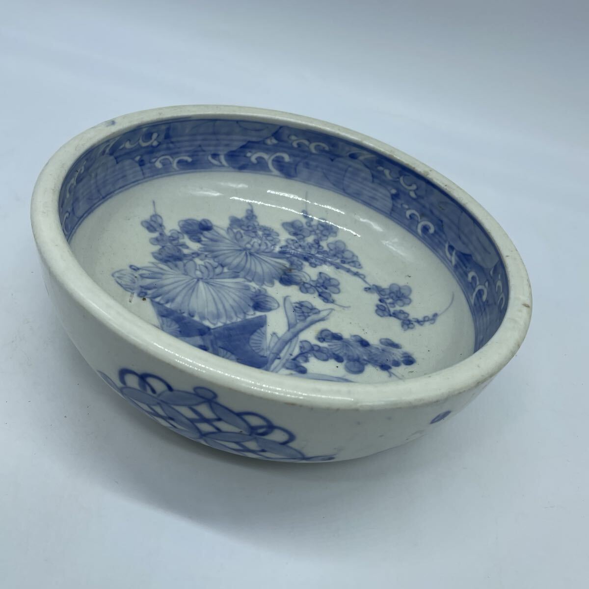 - 染付 大鉢 時代物 深鉢 陶器 皿 骨董 菊 梅 花文