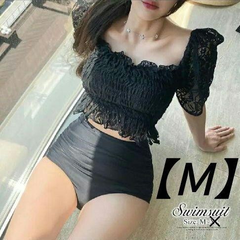 - 水着 2点セット 【M】レースビキニ オフショルダー シースルー ハイウエスト COCOMOMO ブラック